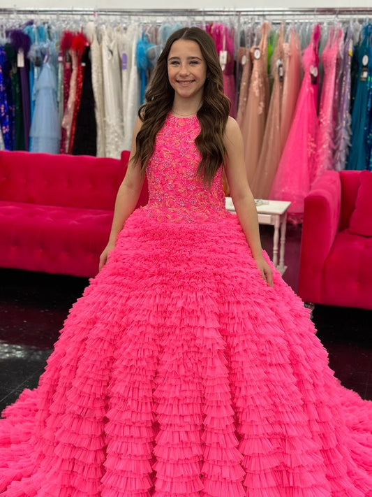 Ashley Lauren Kids 8198 Size 16 Hot Pink Ballgown Tulle Ruffles Beaded Bustier Halter Neckline Ballgown