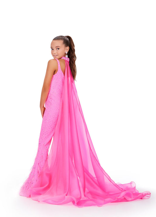 Ashley Lauren Kids 8210 Size 14 Hot Pink Pageant Jumpsuit Crystal Feather Embellished Bell Bottom Cape