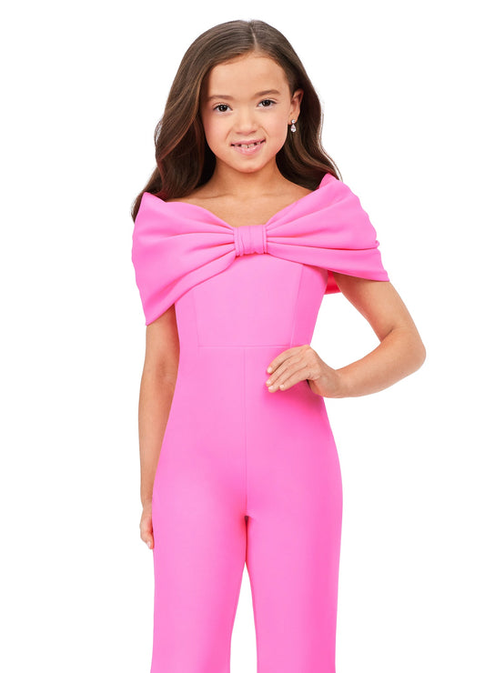 Ashley Lauren Kids 8227 Size 4, 8 Hot Pink Scuba off the Shoulder Bow Pageant Jumpsuit Girls