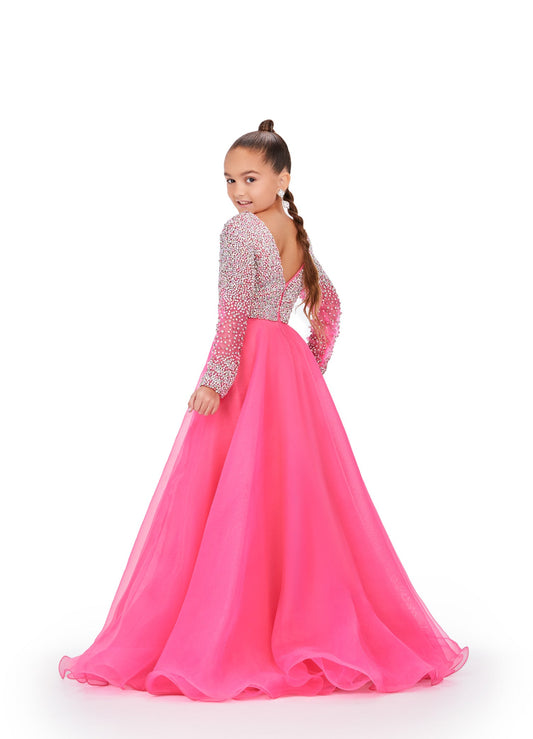 Ashley Lauren Kids 8271 Size 6 Hot Pink Girls Pageant Dress Crystal Long Sleeve A Line Pageant Dress Beaded Gown