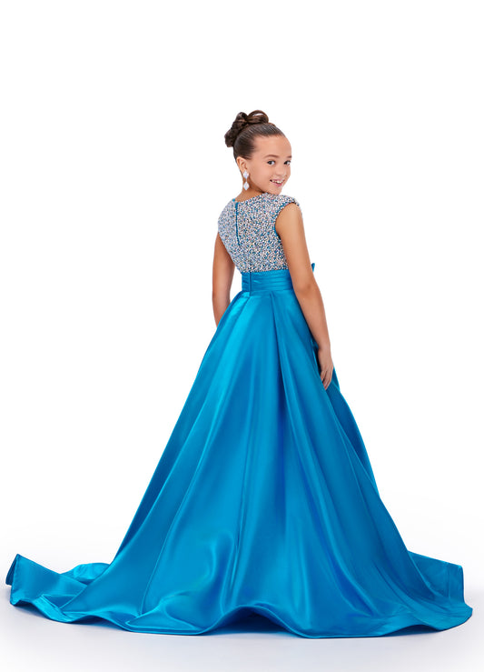 Ashley Lauren 8247 Girls Satin Pageant Dress Ballgown Crystal Pearl Bodice Bow Cap Sleeve