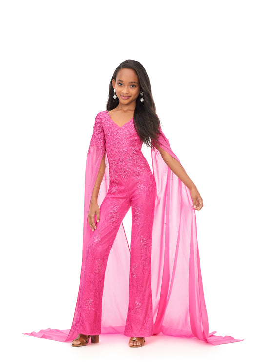 Ashley Lauren Kids 8178 Size 12 Fuchsia Girls Pageant Jumpsuit Scuba One Shoulder Jumpsuit with Bell Sleeve