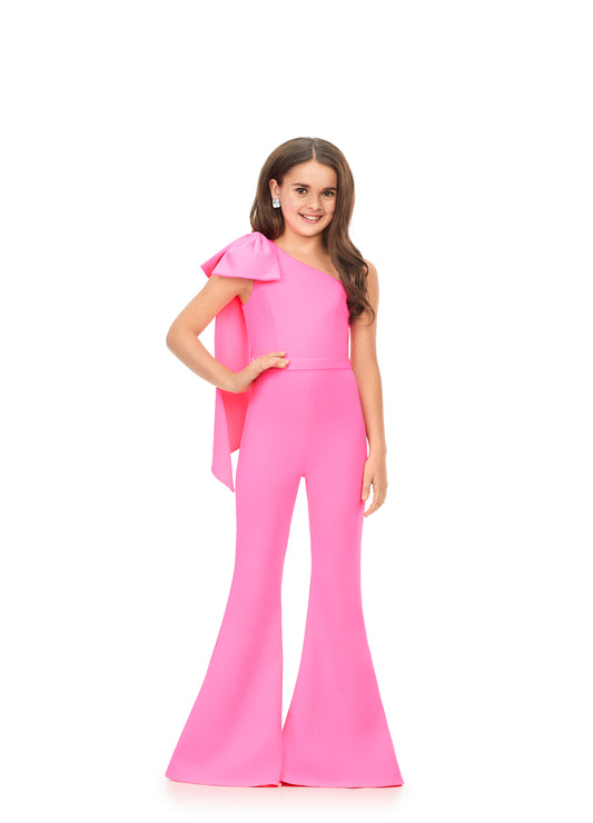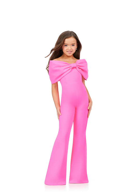 Ashley Lauren Kids 8227 Size 4, 8 Hot Pink Scuba off the Shoulder Bow Pageant Jumpsuit Girls