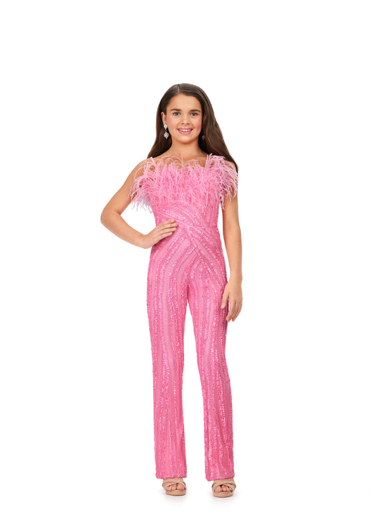 Ashley Lauren Kids 8210 Size 14 Hot Pink Pageant Jumpsuit Crystal Feather Embellished Bell Bottom Cape