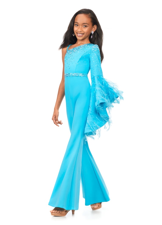 Ashley Lauren Kids 8114 Size 8 Turquoise Girls Scuba jumpsuit Pageant off the shoulder Feather Fun Fashion