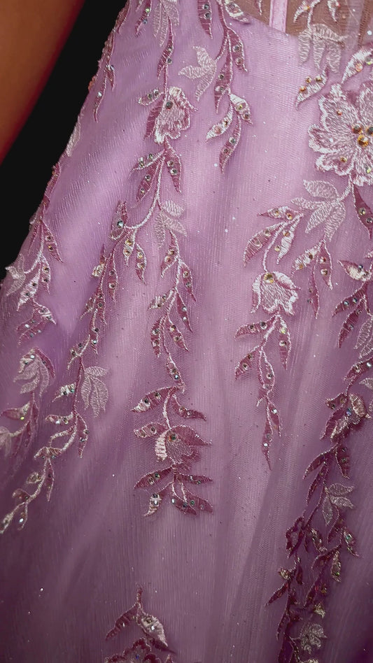 Ashley Lauren 11526 Long Prom Dress Corset Spaghetti Strap Gown V-Neckline Glitter Tulle Skirt Formal Pageant