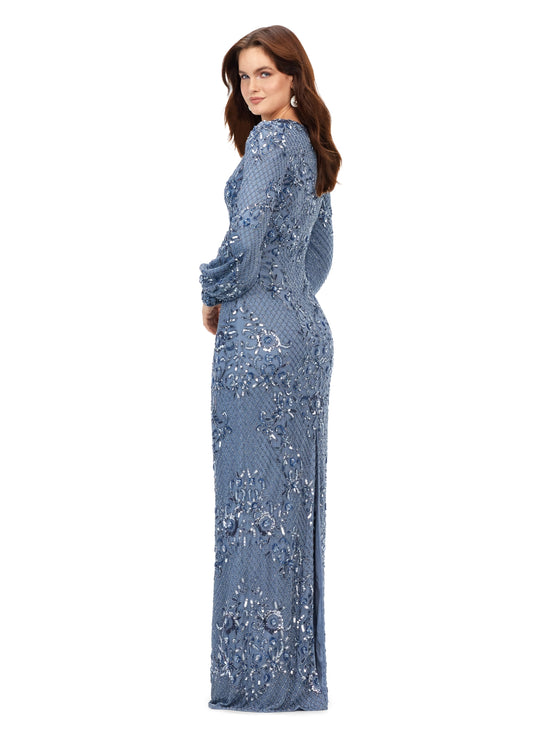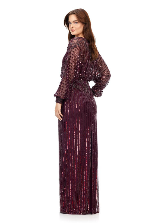 Ashley Lauren 11193 Long Evening Gown Beaded V-Neck Dress With Bishop Sleeves Fully Sequin Formal Dress
