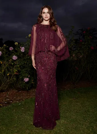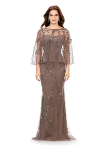 Ashley Lauren 11235 Beaded Evening Gown Long Dress Multi Tiered Sequin V-Neck Butterfly Sleeve