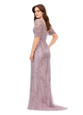 Ashley Lauren 11216 Long Evening Gown Butterfly Sleeve Fully Beaded Crew Neckline Keyhole Back Evening Dress