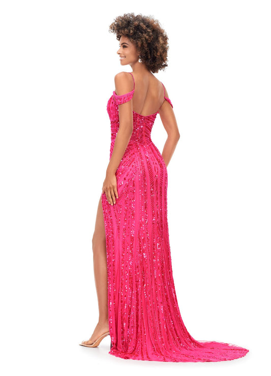 Ashley Lauren 11257 Off the Shoulder Beaded Prom Dress Slit Spaghetti Straps