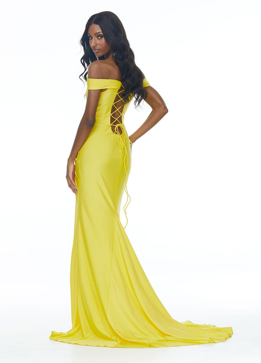 Ashley Lauren 11031 size 2 Yellow off the shoulder jersey prom dress pageant gown side slit