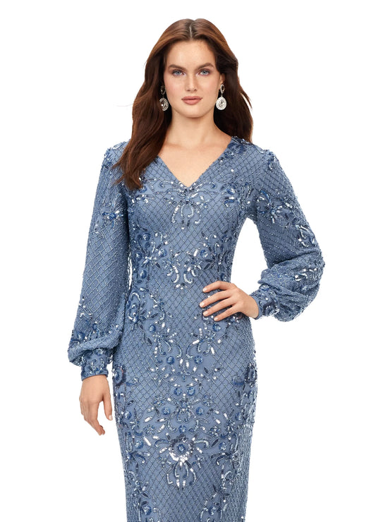 Ashley Lauren 11193 sz 18 Vintage Blue Long Formal Dress Beaded With Bishop Sleeves Fully Sequined Gown