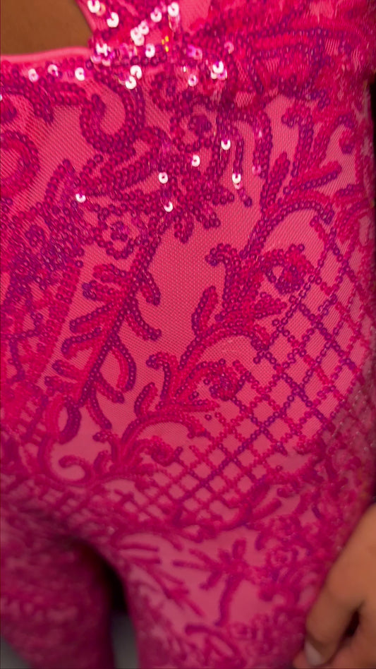 Ashley Lauren 11465 One Shoulder Stretch Sequin Jumpsuit Cut Out and Feather Cuff Prom Formal