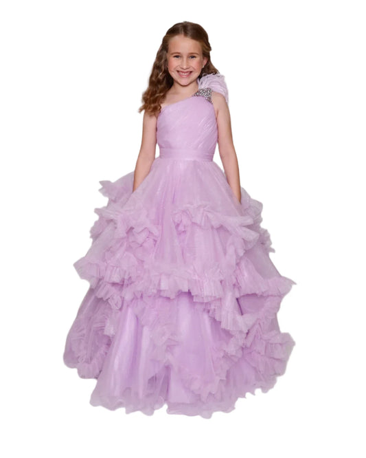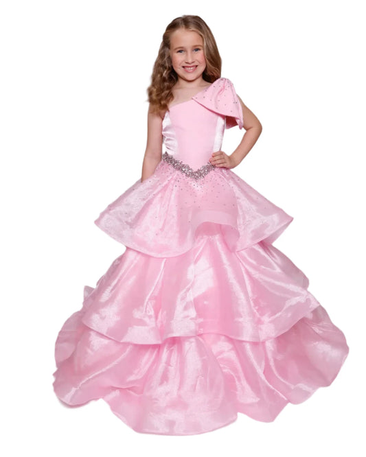 Ava Presley Girls 39891 Long Pageant Ball Gown One Shoulder Layer Ruffle Bow Drop Waist Formal