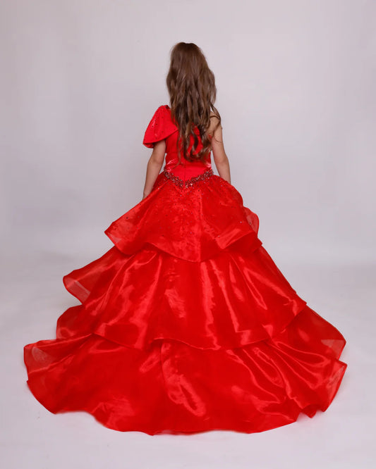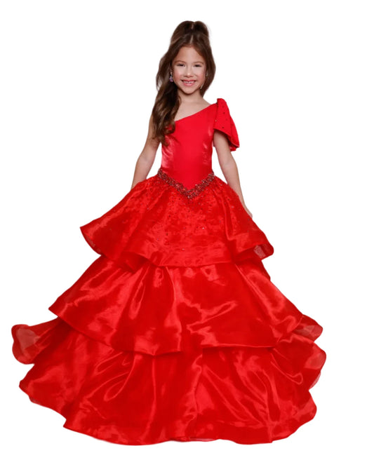 Ava Presley Girls 39891 Size 14 Red Long Pageant Ball Gown One Shoulder Layer Ruffle Bow Drop Waist Formal