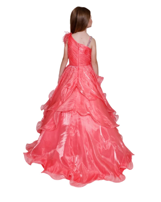 Ava Presley Girls 39887 Size 4 Coral Long Shimmer Layer Pageant Dress Feather One Shoulder Crystal Gown
