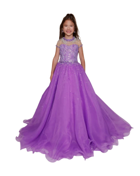 Ava Presley 38043 Girls Pageant Dress Sheer High Neck Ballgown cap sleeve crystal organza Train