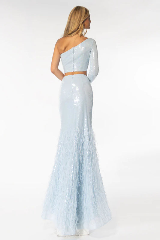 Ava Presley 39243 Long Prom 2pcs Sequin Dress One Sleeve Feather Detail Skirt Formal Pageant
