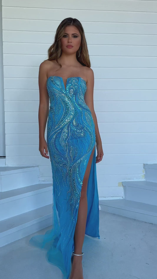 Ava Presley 39219 Long Prom Dress Sexy Fitted Strapless Beaded Detail High Slit Sweetheart Neckline Formal Pageant Gown