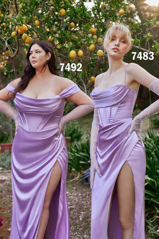 Ladivine 7483 Corset Prom Dress Bridesmaid Slit Luxe Satin Formal Gown Cowl Neck