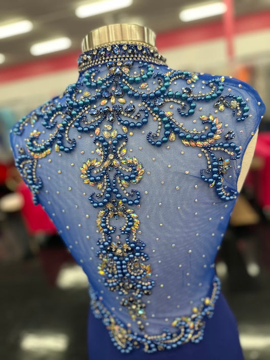 Envious Couture 16147 Size 8 Royal Blue prom dress pageant gown Slit Sheer High Neck