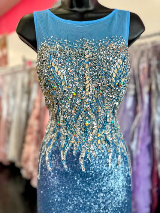 Precious Formals L46814 Size 0 Blue Sequin High Neck prom dress Formal Evening Pageant Gown