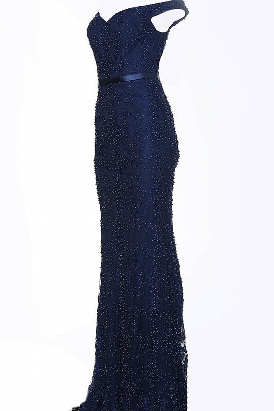 Jovani JVN 66695 Size 4 Navy Lace Pearls Embellished Prom Dress Pageant Gown