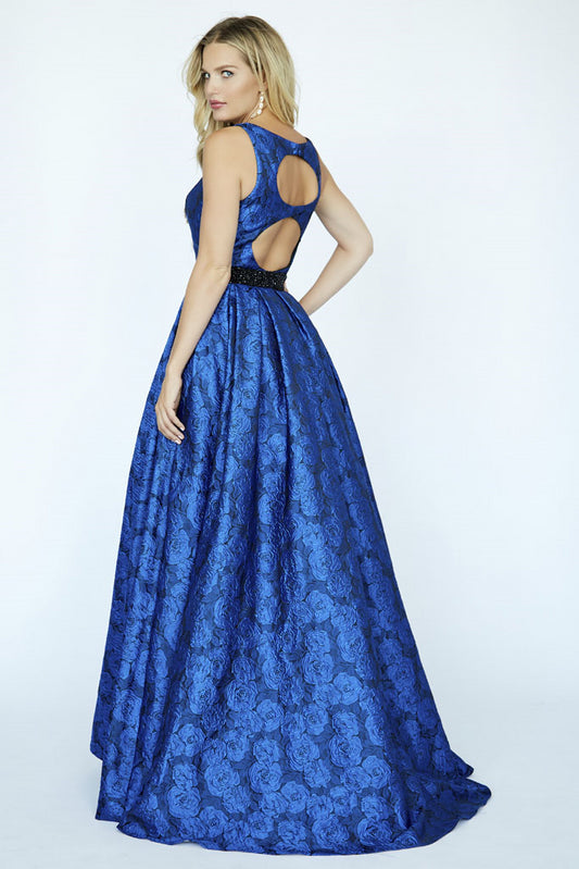 Jolene Collection 19061 Size 12 Royal and Black Floral Print Brocade Dress V Neck Prom Gown Pockets