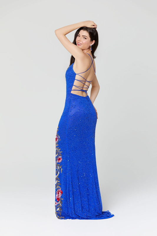 Primavera Couture 3427 size 10 Royal Blue sequin beaded prom dress floral slit details