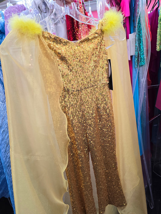 Marc Defang KIDS 8099K Size 4 Gold Pageant Jumpsuit sequins off the shoulder straps cape and feathers