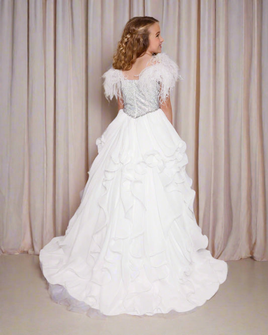 Ava Presley 38039 Size 12 White Feather Crystal Girls Pageant Dress Ruffle A Line Skirt Ball Gown