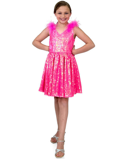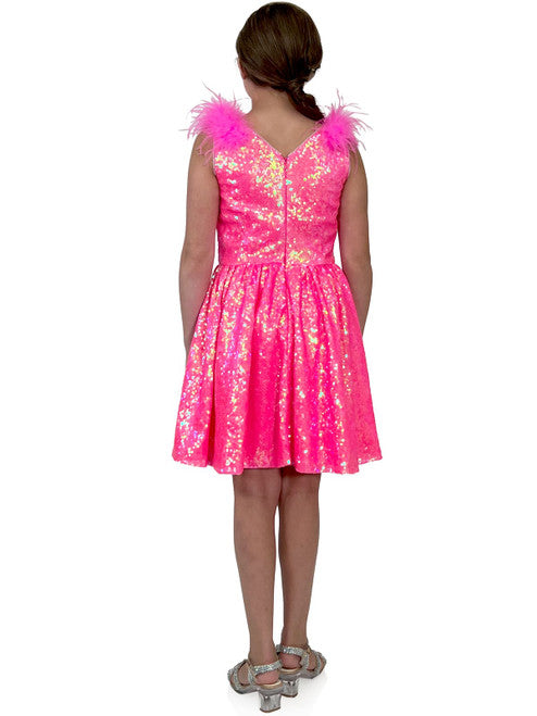 Marc Defang 5147 Size 6 Barbie Pink Girls Short Sequin Feather V Neck Cocktail Dress A Line Pageant Formal Wear