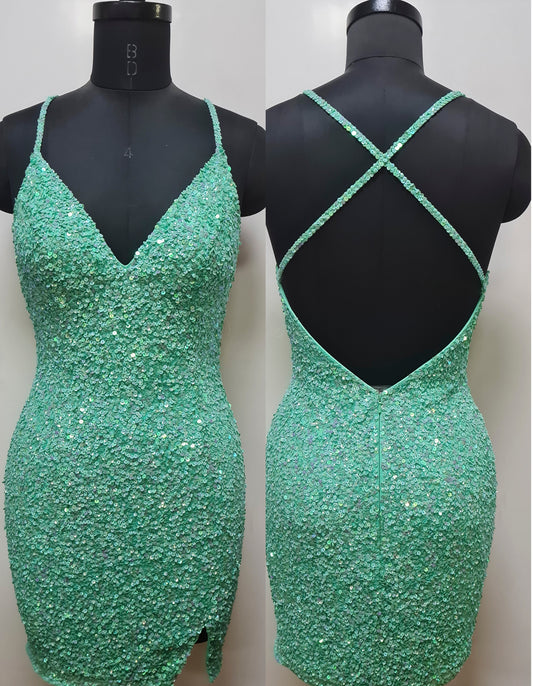 Primavera Couture 3900 Size 10 Jade Cocktail Dress Sequin Cross Back V-Neck Slit Short Homecoming Cocktail Dress.