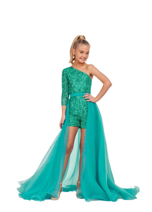 Sugar Kayne C347 Size 8 Lemonburst Girls Pageant One Shoulder Romper Sequin Mesh Overskirt Fun Fashion Shimmer