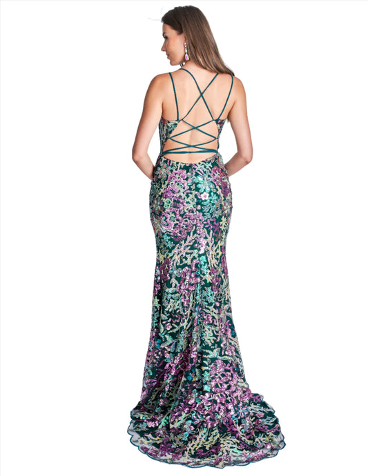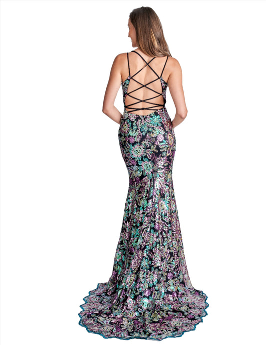 Nina Canacci 2391 Size 4 Black Multi Sequin Print Sheer Corset Prom Dress Slit Formal Evening Gown Floral Backless Gown