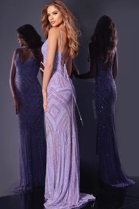 Jovani 38848 Size 4 Lilac Long Beaded Sequin Prom Dress Formal Corset Gown Pageant V Neck Tassel