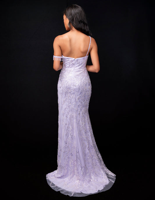 Nina Canacci 9160 Size 4 Purple Beaded Fringe Slit Formal Dress One Shoulder sheer sequin off the shoulder
