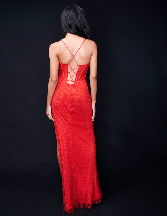 Nina Canacci 1574 Size 4 Red Sheer Crystal Corset Prom Dress Evening Gown Slit Scoop Neck