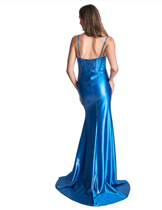 Ladivine CD295 Size 6 Paris Blue Satin Maxi Slit Sheer Point Crystal Corset Prom Dress Formal Evening Gown