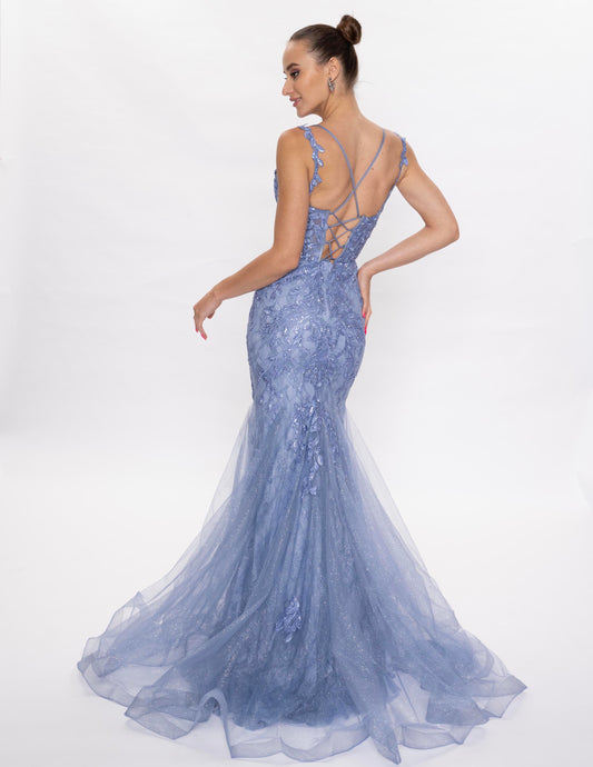 Nina Canacci 7600 Size 6, 10 Steel Blue Prom Dress Mermaid Lace Plunging V Neckline Corset Lace Straps
