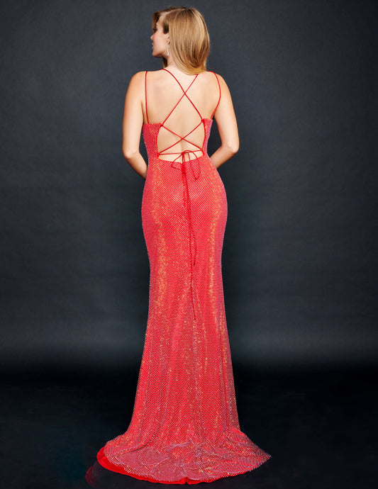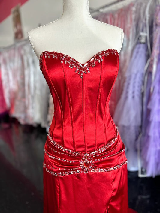 Nina Canacci J4098 Size 12 Red Long Satin Corset Prom Dress Slit Formal Gown Beaded Sequin