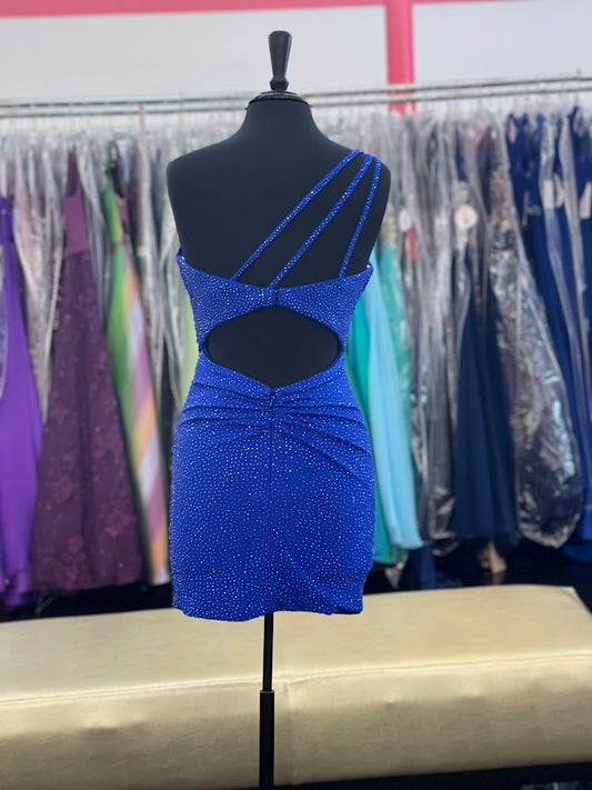 Amarra 87157 Size 8 Royal Short Fitted Rhinestone One Shoulder Formal Cocktail Dress Ruched Bodice