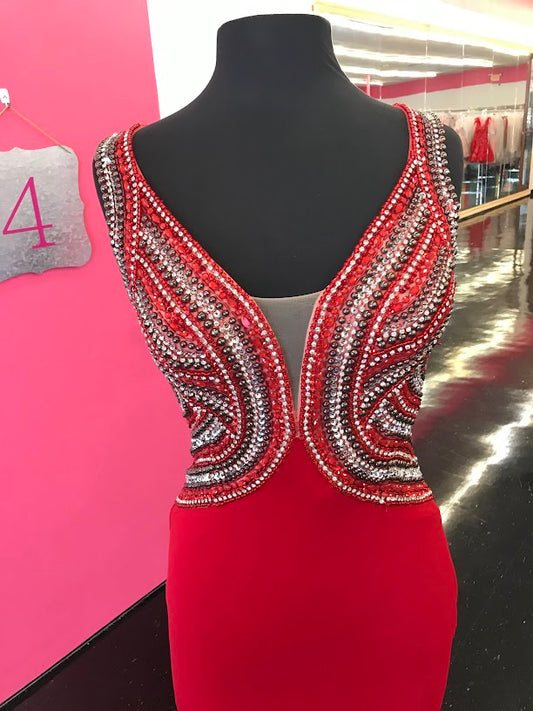 Jovani JVN36850 Size 4 Red Long Embellished v Neck Backless Formal Dress Evening Gown