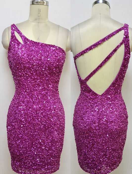 Primavera Couture 3573 Size 14 Fuchsia Cocktail Dress One Shoulder Double Strap Fitted Sequins Backless