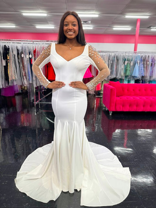 Johnathan Kayne 2441 Size 8 White Long Sleeved Evening Dress Crystal Sheer Sleeves