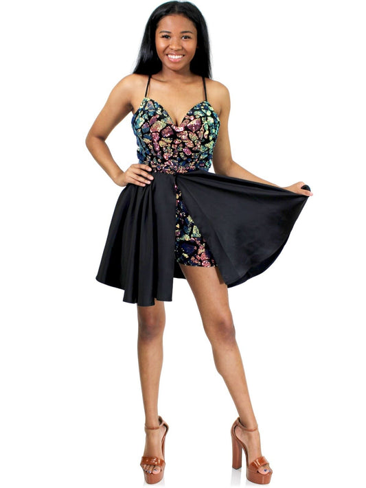 Marc Defang 6010 size 6 Black Multi Romper iridescent sequins detachable satin overskirt fun fashion