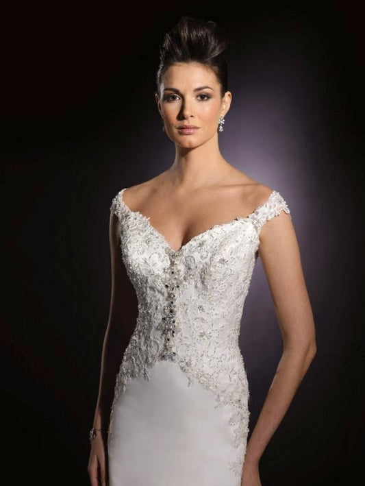 Mon Cheri 110230 Size 26W Satin Fit & Flare Wedding Dress Lace Sheer Cap sleeves