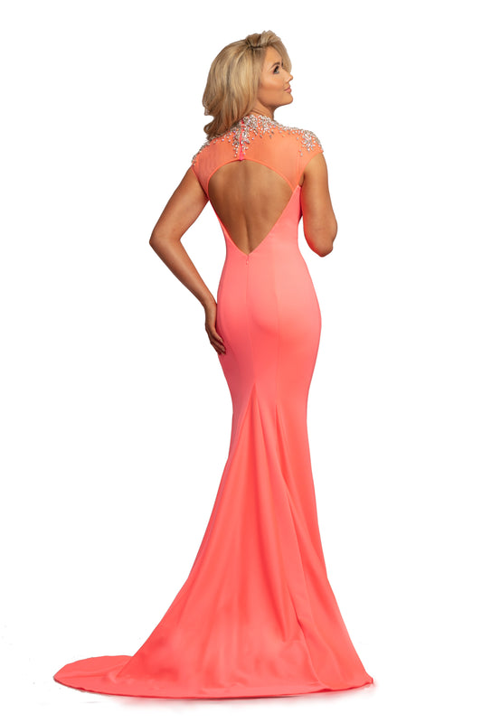 Johnathan Kayne 2024 Size 6 Hot Coral Mermaid Slit Prom Dress Pageant Gown Sheer Neckline Crystal
