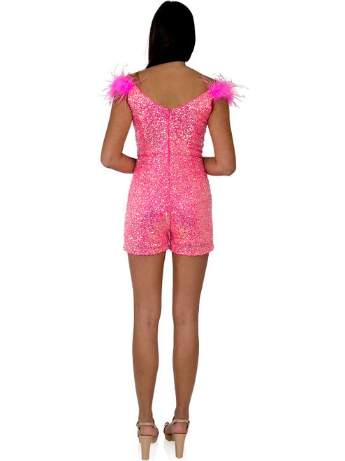 Marc Defang 8252 Size 0 Hot Pink Short Sequin Pageant Romper off the shoulder feather v neck fun fashion