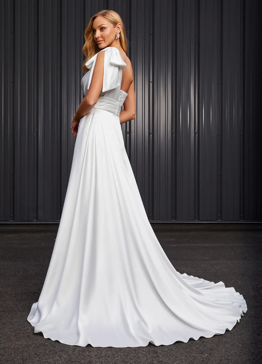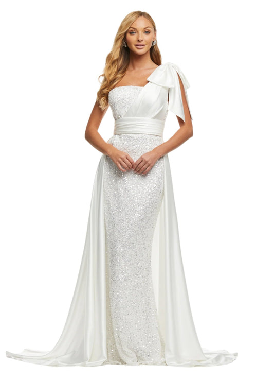 Ashley Lauren 11104 Size 4,8,12 Ivory Overskirt One Shoulder Bow Satin Long Overskirt Pageant Bridal Wedding